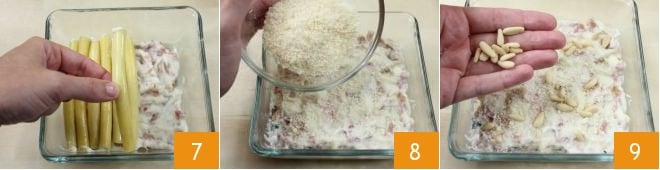 Coupez les tranches de speck en julienne 2 et faites-les légèrement griller dans une poêle sans huile. Mélangez le speck rôti avec la béchamel 3 et mettez-la de côté.