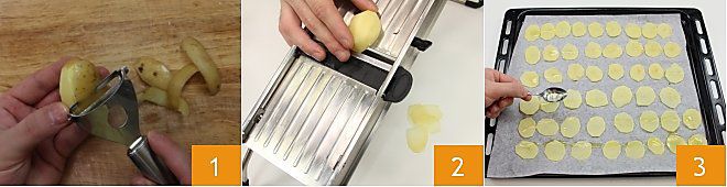 Pour préparer les tours de pommes de terre sur écrasé, commencez par prendre les pommes de terre. Lavez les pommes de terre avec soin et épluchez-les avec un éplucheur 1. Coupez les pommes de terre en tranches assez fines (environ 3 mm) à l'aide d'une mandoline 2, si vous n'en avez pas, vous pouvez faire la même opération avec un couteau. Faites attention à couper les pommes de terre en les maintenant droites, afin d'obtenir des tranches aussi rondes et régulières que possible. À ce stade, disposez les tranches de pommes de terre sur une plaque de cuisson recouverte de papier sulfurisé et arrosez-les d'un filet d'huile 3.
