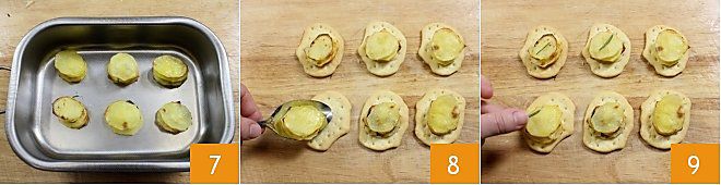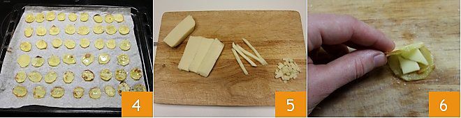 Enfournez dans un four préchauffé à 250° pendant 10 minutes, (si four ventilé 230° pendant 5/6 minutes), jusqu'à ce qu'elles soient dorées. Pendant que les pommes de terre tiédissent 4, coupez le fromage en fines tranches avec lesquelles vous allez composer les tours 5. Commencez maintenant à composer la tour de pommes de terre : disposez sur la première tranche de pomme de terre les tranches de fromage, du sel, du poivre et du romarin. Superposez ensuite une deuxième tranche de pomme de terre et assaisonnez à nouveau avec des tranches de fromage, du sel, du poivre et du romarin 6. Procédez de la même manière jusqu'à former une "tour" composée de quatre tranches de pommes de terre et trois couches de fromage.