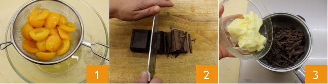Pour préparer le gâteau au chocolat avec abricots et amaretti, mettez à égoutter les abricots du liquide de conservation 1. Ensuite, hachez le chocolat noir 2 et mettez-le dans une petite casserole pour le faire fondre à feu très doux avec le beurre 3.