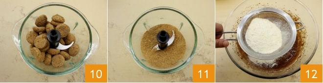 Ensuite, mettez de côté 12 amaretti et hachez les autres pour les réduire en poudre (10-11); tamisez la farine dans la pâte 12 et mélangez avec une spatule ;