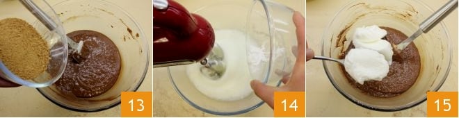 puis ajoutez la poudre d'amaretti et mélangez bien le tout 13. Montez les blancs d'œufs en neige avec le sucre glace restant 14. Ajoutez délicatement les blancs au mélange, en remuant de haut en bas pour ne pas les faire retomber 15.
