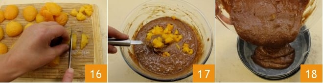 Enfin, tamponnez les abricots avec un torchon et coupez-les en petits dés 16, en laissant de côté 8 entiers pour la décoration. Ajoutez les morceaux d'abricots dans la pâte et mélangez 17; puis farinez et tapissez de papier sulfurisé un moule à gâteau de 23 cm de diamètre. Versez la pâte à l'intérieur 18 et répartissez-la avec une spatule.