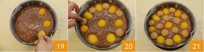 Ensuite, disposez délicatement les abricots à la surface, avec la partie concave vers le haut 19. Vous pouvez les espacer légèrement et en placer 7 sur le bord et un au centre. Vous devrez laisser de la place pour les 12 amaretti que vous pourrez alterner avec les abricots 20. Une fois terminé 21, faites cuire le gâteau dans un four statique préchauffé à 180° pendant 45 minutes (160° pendant environ 35 minutes si four ventilé).