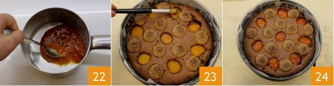 Pendant ce temps, faites fondre la confiture d'abricots à feu très doux 22 : lorsque le gâteau est prêt, sortez-le du four et, encore chaud, passez la confiture sur les abricots avec un pinceau 23. Le gâteau au chocolat avec abricots et amaretti est prêt à être servi 24 !