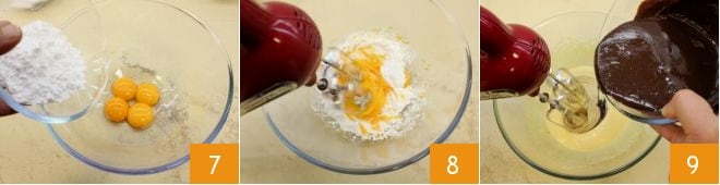 et montez les premiers avec les deux tiers du sucre glace 7 : vous pouvez utiliser un batteur électrique 8 ou un fouet à main. Puis versez le chocolat fondu légèrement refroidi et continuez à travailler le mélange 9.
