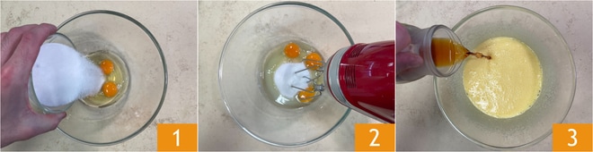 Pour préparer le gâteau au thé sans lactose, commencez par porter à ébullition 200 g d'eau et infusez les sachets de thé. Prélevez 150 g de thé et laissez refroidir complètement. Dans un bol, mettez les œufs, le sucre 1 et une pincée de sel, puis battez avec un fouet électrique jusqu'à obtenir un mélange homogène 2. Ajoutez ensuite le thé refroidi 3.
