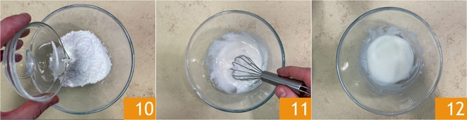 Entre-temps, préparez le glaçage : dans un bol, mélangez le sucre glace et l'eau 10, puis remuez bien avec un fouet 11 jusqu'à obtenir un mélange homogène 12.