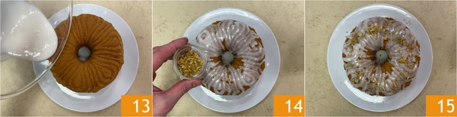 Vérifiez la cuisson avec un cure-dent, puis sortez le gâteau du four et laissez-le refroidir dans le moule. Une fois refroidi, démoulez-le sur un plat de service et recouvrez-le de glaçage 13. Décorez à votre goût avec des fleurs comestibles 14 et servez votre gâteau au thé sans lactose 15 !