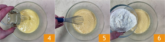 Ajoutez également l'huile végétale 4 et mélangez rapidement 5, puis incorporez la farine 6.