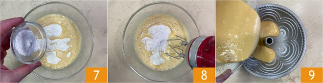Ajoutez la levure chimique 7 et mélangez le tout avec le fouet 8. Transférez le mélange dans un moule à savarin de 24 cm de diamètre 9, huilé et fariné, et faites cuire dans un four statique à 180°C pendant 45-50 minutes.