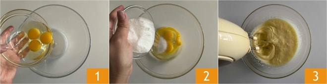 Pour préparer le gâteau à la crème, commencez par verser les œufs entiers 1 et le sucre dans un grand bol 2. Travaillez ensuite avec un batteur électrique, jusqu'à ce que les œufs soient clairs, gonflés et mousseux 3.