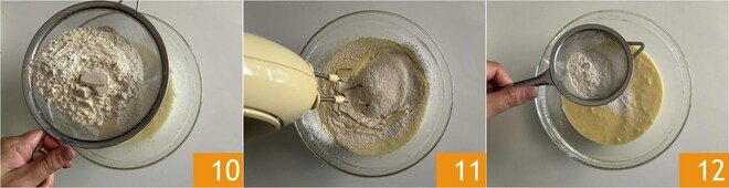 Vous pouvez maintenant incorporer la farine, en veillant à la tamiser avec un tamis 10. Après l'avoir bien mélangée 11, il ne vous reste plus qu'à ajouter la levure, toujours tamisée 12.