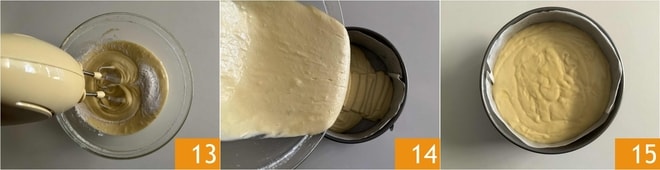 À ce stade, continuez à mélanger avec le batteur électrique, jusqu'à obtenir une pâte crémeuse et homogène 13. Versez la préparation dans un moule à charnière de 18-20 cm tapissé de papier sulfurisé ou beurré et fariné 14 15. Faites cuire dans un four statique préchauffé à 180° sur la grille du milieu pendant environ 45 minutes. Les temps peuvent varier selon le four, vérifiez la cuisson avec un cure-dent.
