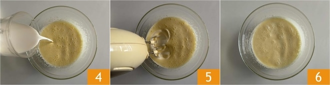 Ensuite, ajoutez la crème fraîche 4 et continuez à travailler avec le batteur électrique 5 pour bien mélanger le tout 6.