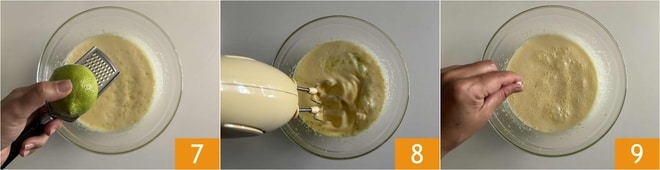 Continuez en ajoutant le zeste d'un citron râpé 7, continuez à mélanger 8 et ajoutez une pincée de sel 9.