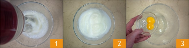 Pour préparer le gâteau caprese à la pistache, commencez par séparer les jaunes des blancs d'œufs. Montez les blancs d'œufs 1 en neige bien ferme 2 et réservez. Mettez les jaunes d'œufs dans un autre bol 3.