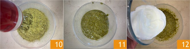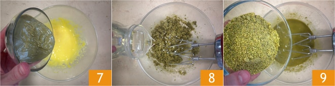 Ajoutez la pâte de pistache 7 et travaillez à nouveau pour amalgamer. À ce stade, ajoutez l'huile de graines 8 et la farine de pistache 9.