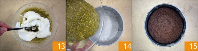 Mélangez délicatement de bas en haut pour ne pas casser les blancs d'œufs 13. Versez le tout dans un moule à charnière de 20 cm de diamètre tapissé de papier sulfurisé 14 et faites cuire dans un four statique préchauffé à 170° pendant 30 minutes 15.