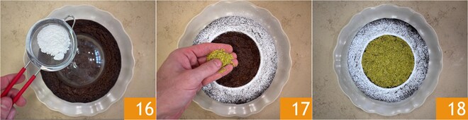Laissez refroidir complètement, puis placez un petit bol au centre du gâteau et saupoudrez de sucre glace 16. Retirez le bol et décorez l'espace vide avec de la farine de pistache 17. Votre gâteau caprese à la pistache est prêt à être dégusté 18 !
