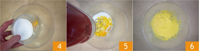 Ajoutez le sucre 4 et travaillez avec les fouets électriques 5 jusqu'à obtenir un mélange homogène 6.