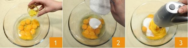 Pour réaliser le gâteau à la crème multicolore, commencez par la pâte de base : dans un bol, mettez les œufs et les jaunes, le miel 1, ajoutez le sucre en poudre 2 et battez avec un batteur électrique 3 (ou un robot pâtissier)