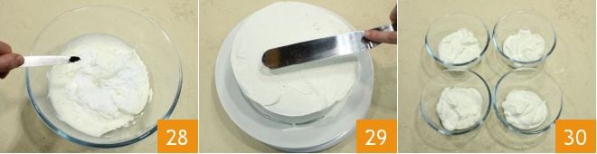 et ajoutez-les à la crème fraîchement montée 28. Divisez la crème en 5 parts, prélevez une part pour recouvrir tout le gâteau 29, en nivelant la surface avec une spatule pour qu'elle soit bien lisse. Transférez le reste de la crème dans 4 bols séparés 30