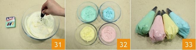 colorez chaque crème avec une couleur différente en ajoutant à la crème quelques gouttes de colorant à la fois jusqu'à obtenir la couleur désirée 31 ; nous avons réalisé des couleurs pastel : rose (avec un peu de colorant rouge), jaune, vert (en combinant le colorant jaune avec le bleu) et bleu clair (avec un peu de colorant bleu) 32. Transférez les crèmes dans 4 poches à douille avec des douilles en étoile 33