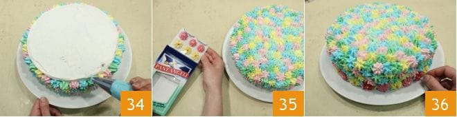 garnissez le bord et toute la surface du gâteau avec des touffes de crème colorée 34 en alternant les couleurs. Pour finir, prenez les petites fleurs en sucre 35 et appliquez-les sur le bord tout autour du gâteau 36. Le gâteau à la crème multicolore est prêt, il ne vous reste plus qu'à le porter à table !