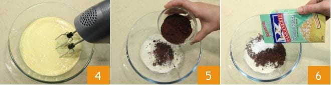 jusqu'à obtenir un mélange clair et mousseux 4. Dans un autre bol, mettez la farine, le cacao 5 et la fécule 6.
