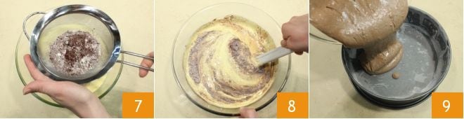 Tamisez les ingrédients secs et ajoutez-les dans le bol contenant le mélange d'œufs 7, mélangez avec une cuillère 8 pour homogénéiser les ingrédients. Versez la pâte dans un moule de 23 cm de diamètre, beurré et recouvert de papier sulfurisé 9.