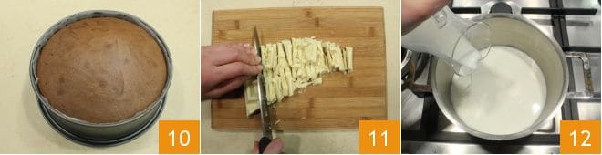 Cueillez le biscuit dans un four statique préchauffé à 180° pendant 45 minutes (ou dans un four à convection à 160° pendant 35 minutes). Une fois cuit, sortez le moule du four 10 et laissez refroidir avant de démouler le gâteau. Maintenant, occupez-vous de la garniture : hachez le chocolat blanc 11, puis mettez une casserole avec le lait sur le feu 12 et portez à ébullition.