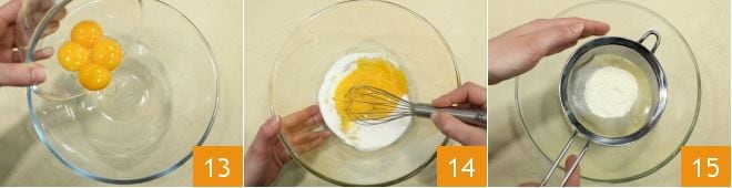 En attendant, dans un bol, mettez les jaunes d'œufs 13, ajoutez le sucre en poudre et mélangez avec un fouet 14 jusqu'à obtenir un mélange clair et mousseux, à ce moment, incorporez la farine tamisée 15.