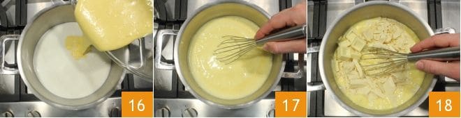Versez le mélange dans le lait chaud 16 et en continuant de mélanger 17, ajoutez également le chocolat blanc haché 18, continuez la cuisson à feu doux jusqu'à épaississement de la crème.