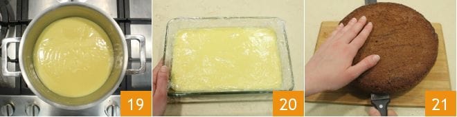 Lorsque la crème a épaissi 19, éteignez le feu et transférez-la dans un grand bol en verre pour qu'elle refroidisse rapidement, en veillant à la recouvrir d'un film plastique au contact 20. Pendant ce temps, le biscuit aura refroidi, démoulez-le et coupez-le horizontalement pour obtenir 3 disques 21.