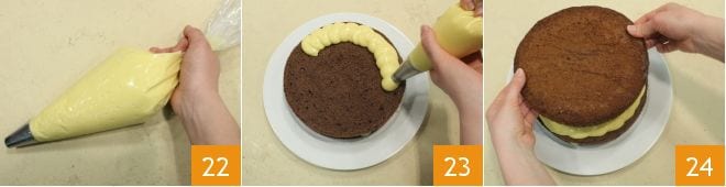 Transférez la crème froide dans une poche à douille avec une douille lisse 22, placez le disque de base sur un plat de service et garnissez le premier disque de biscuit avec la crème 23. Couvrez avec un deuxième disque de biscuit, garnissez à nouveau avec la crème et refermez avec le troisième disque de biscuit au cacao 24.
