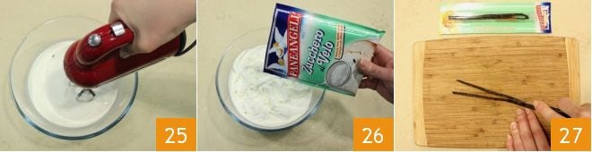 Maintenant, consacrez-vous à la décoration : montez la crème avec un batteur électrique 25, ajoutez le sucre glace 26, puis fendez une gousse de vanille dans le sens de la longueur, avec un couteau, extrayez les graines 27