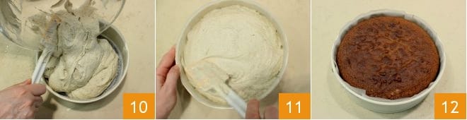 Beurrez et chemisez avec du papier sulfurisé un moule de 24 cm de diamètre et versez-y la pâte 10, en l'aplanissant bien avec la spatule 11. Faites cuire dans un four statique préchauffé à 180°C pendant 60 minutes (ou dans un four ventilé à 160°C pendant 50 minutes) : si après 30-40 minutes la surface du gâteau devait trop brunir, couvrez-le avec une feuille de papier aluminium et poursuivez la cuisson. Vérifiez la cuisson en insérant un cure-dent au centre du gâteau qui, une fois retiré, doit ressortir sec et propre ; sinon, laissez cuire encore quelques minutes. Une fois prêt 12, sortez le gâteau du four et démoulez-le, en le laissant refroidir complètement sur une grille.