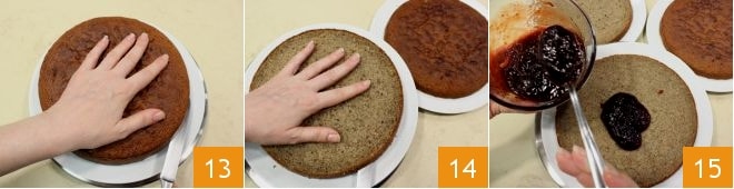 Lorsque le gâteau de sarrasin est complètement froid, coupez-le horizontalement en 3 parties avec un couteau à lame lisse (13-14) ; avec une cuillère, étalez délicatement la confiture de groseilles sur la surface du premier disque jusqu'aux bords (conservez une cuillère de la dose nécessaire) 15.