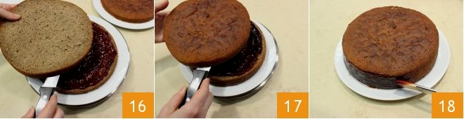 Recouvrez avec le deuxième disque 16 et garnissez à nouveau, puis terminez le gâteau en plaçant le dernier disque 17. À ce stade, vous pouvez procéder aux décorations : badigeonnez les bords du gâteau avec la confiture restante 18