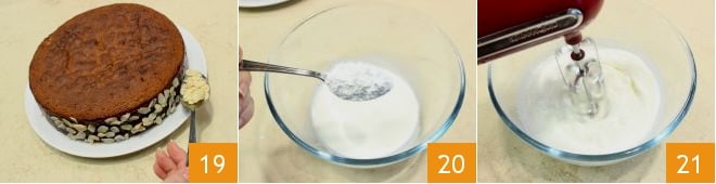 et faites adhérer autour du gâteau les amandes effilées 19. Vous pouvez choisir de décorer le gâteau avec de la crème chantilly : travaillez avec un batteur électrique la crème fraîche avec le sucre glace (20-21).
