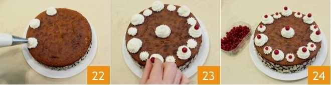 Avec une poche à douille à embout étoile, réalisez des touffes de crème chantilly le long du périmètre 22 et au centre. Enfin, placez sur chaque touffe une groseille rouge pour donner une touche de couleur supplémentaire 23 et enfin servez le gâteau de sarrasin et confiture de groseilles 24.