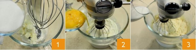 Pour préparer le gâteau de sarrasin et confiture de groseilles, assurez-vous de sortir le beurre, les œufs et le lait du réfrigérateur au moins deux heures avant de réaliser le gâteau. Dans le batteur sur socle, travaillez avec les fouets le beurre ramolli coupé en dés et la moitié du sucre en poudre 1 ; prenez les œufs à température ambiante, séparez les jaunes des blancs (conservez-les car ils vous serviront par la suite) et ajoutez les jaunes 2 et le lait en filet 3.