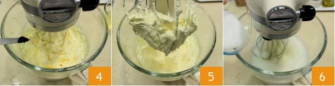 Incisez la gousse de vanille dans le sens de la longueur et prélevez les graines avec un couteau, en les ajoutant au mélange 4 ; continuez avec les fouets jusqu'à obtenir un mélange clair et mousseux 5. Dans un autre bol, commencez à monter les blancs en neige (vous devrez les monter pour qu'ils soient crémeux), et lorsqu'ils seront blancs, ajoutez petit à petit l'autre moitié du sucre que vous avez réservée 6.