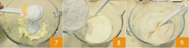 À ce stade, incorporez les blancs en neige au mélange, en mélangeant délicatement avec une spatule de haut en bas pour éviter qu'ils ne tombent 7. Ajoutez petit à petit la farine de sarrasin 8, puis tamisez la levure et mélangez avec la spatule pour éviter la formation de grumeaux 9.