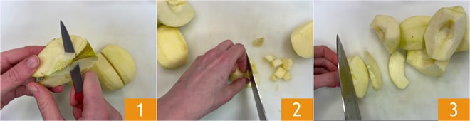 Pour préparer le gâteau aux pommes et noix, commencez par éplucher les pommes et enlever le trognon 1. Coupez une demi-pomme en dés 2 et une pomme et demie en tranches 3.