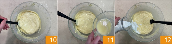 Incorporez délicatement les poudres avec des mouvements du bas vers le haut 10. Ajoutez le beurre fondu 11 et incorporez. Versez le lait en filet 12 et mélangez délicatement.