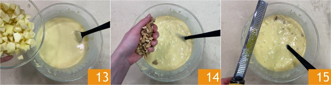 Ajoutez les pommes en dés 13, une partie des noix grossièrement hachées 14, le zeste de citron 15 et une pincée de sel. Mélangez le tout.