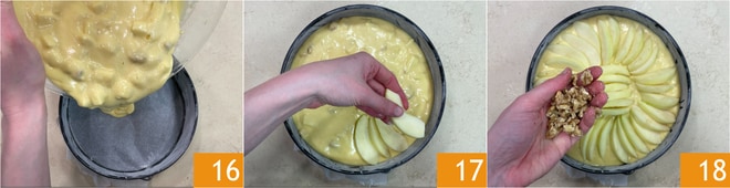 Versez le mélange dans un moule à charnière de 24 cm de diamètre, recouvert de papier sulfurisé, beurré et fariné 16. Nivelez la surface et décorez-la en disposant les tranches de pomme en rayons 17, en veillant à remplir également le centre. Enfin, saupoudrez avec les noix restantes 18.