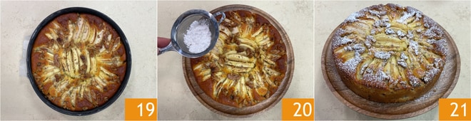 Faites cuire au four statique à 180° pendant 55 minutes 19, en vérifiant la cuisson avec un cure-dent. Sortez du four et laissez tiédir, puis terminez avec une pincée de sucre glace 20. Le gâteau aux pommes et noix est prêt à être servi 21 !